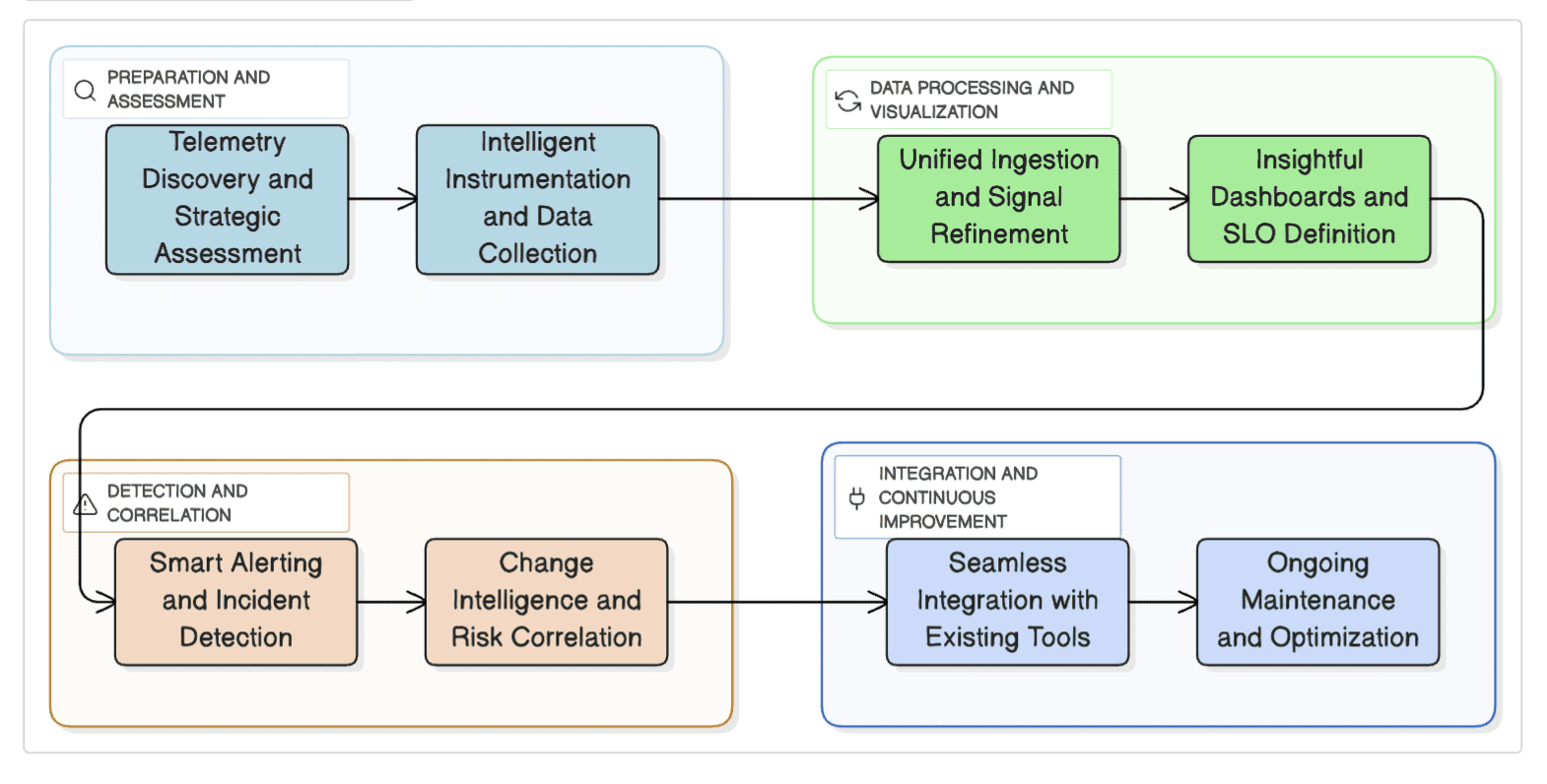 We don’t stop at technical integration, we assess telemetry maturity, noise-to-signal ratio and how observability ties back to your business KPIs. This step helps shape a tailored architecture that aligns with your operational goals and risk posture.
